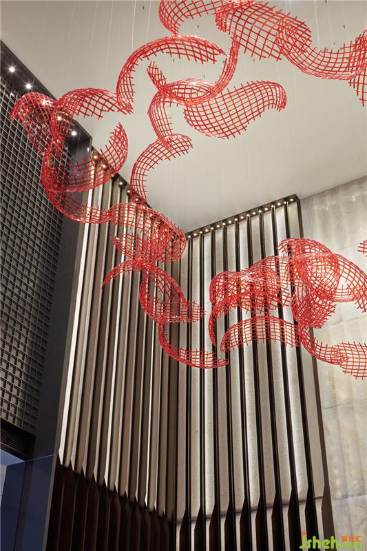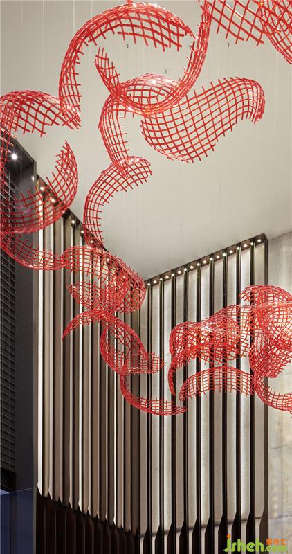 惠州非物质文化遗产—龙门林村盒箩制作工艺,亦是本案设计灵感的主要来源,设计师提取了对盒箩的编制印象展现于室内,如悬于半空的装置品,是采取具有现代感的透明亚克力材质利用热弯工艺制造而成,形似盒箩编制物品,用设计语言重温这份有温度的传统手工技艺。