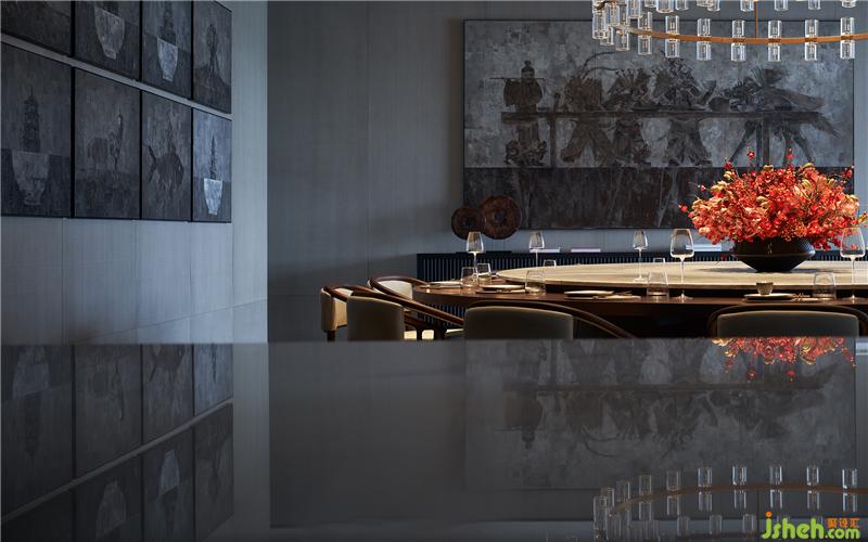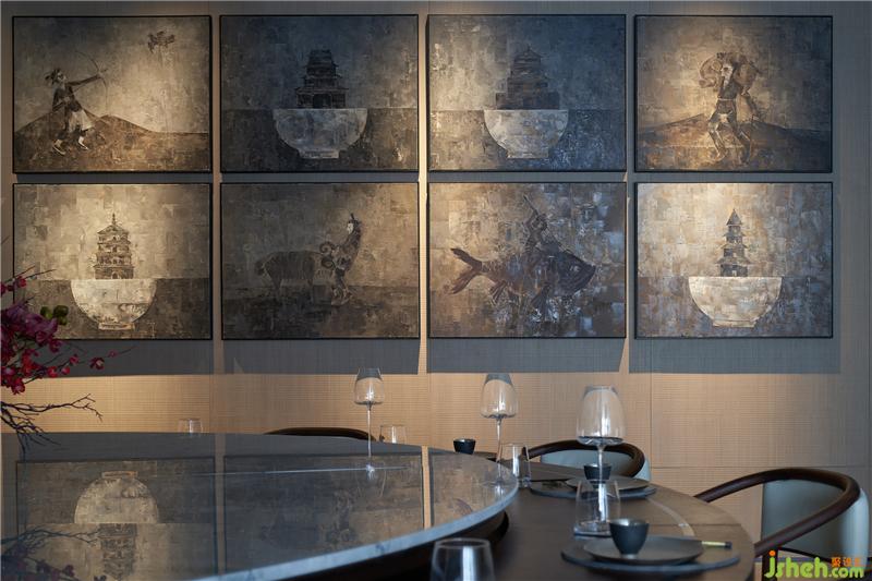 自由是人的天性,也是现代设计的灵魂。设计的笔墨自由地穿梭于新旧之间,在宴会厅中以一组现代艺术家归荣彪的油画艺术《古影似梦》,呈现渭南的皮影文化——怀旧、古朴的色彩,似梦似幻的写意,斑驳迷离地展示着传统文化的特殊魅力。新时代的油画语言,赋予这一古老文化新的解构与诠释,既为空间增添了几分场域记忆浓度,也引发观者的各种冥思和遐想。