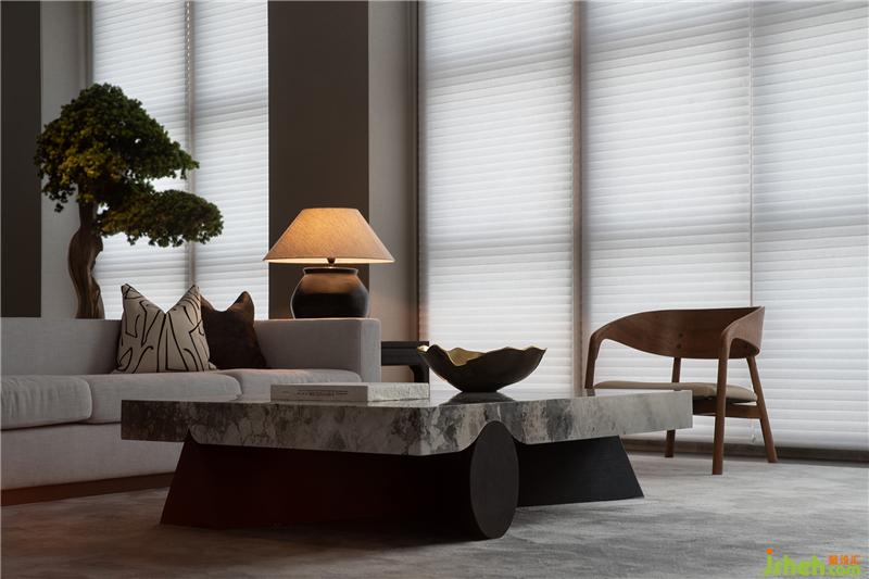 会客区整体以米白为基调,点缀深浅相搭的原木色泽、气质高雅的大理石桌,对称挂墙的书法作品与一旁蓬勃蓊郁的古松,为空间添增文人儒雅的气质,充分塑造了一个具有格调与品质感的会客空间。