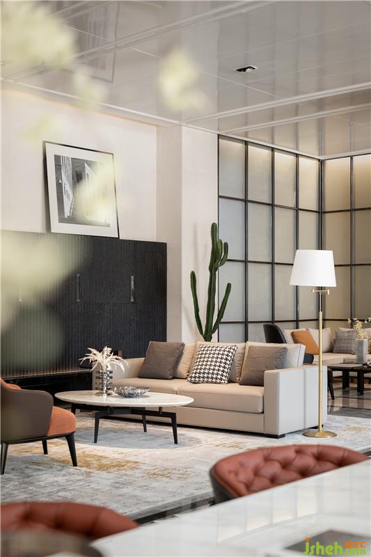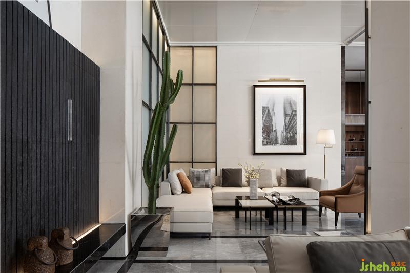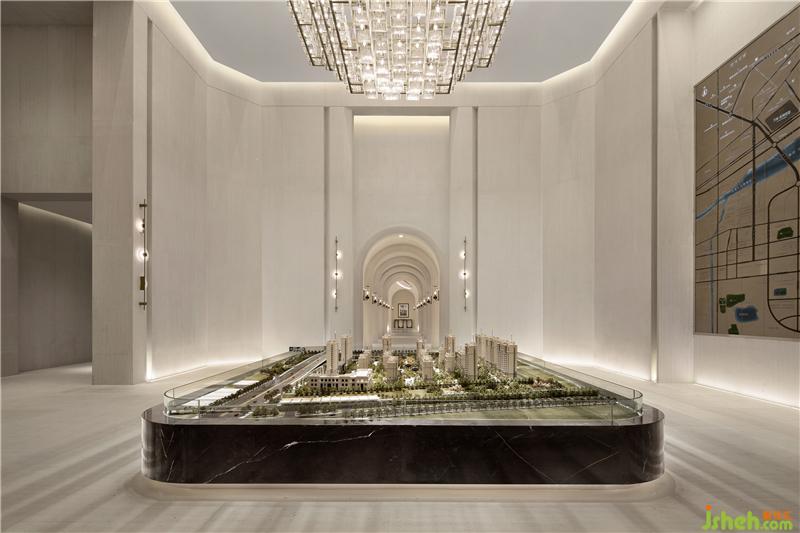售楼处设计在规整的室内结构中,于门框两侧以墨色大理石加强了视效对比,为空间变换打造独具一格的视觉享受,宛如营构了一幅框景,框中正是洽谈空间明媚优雅的光景。