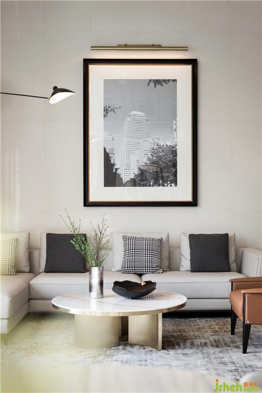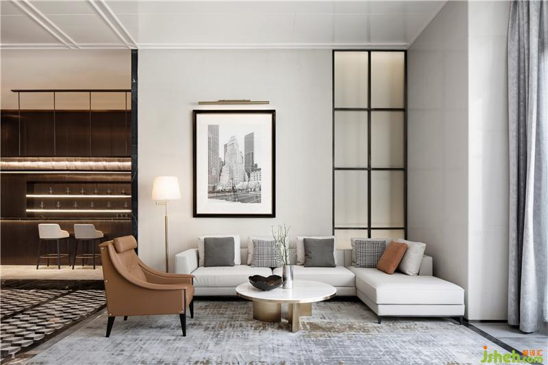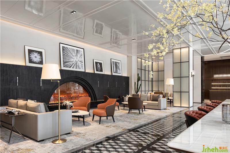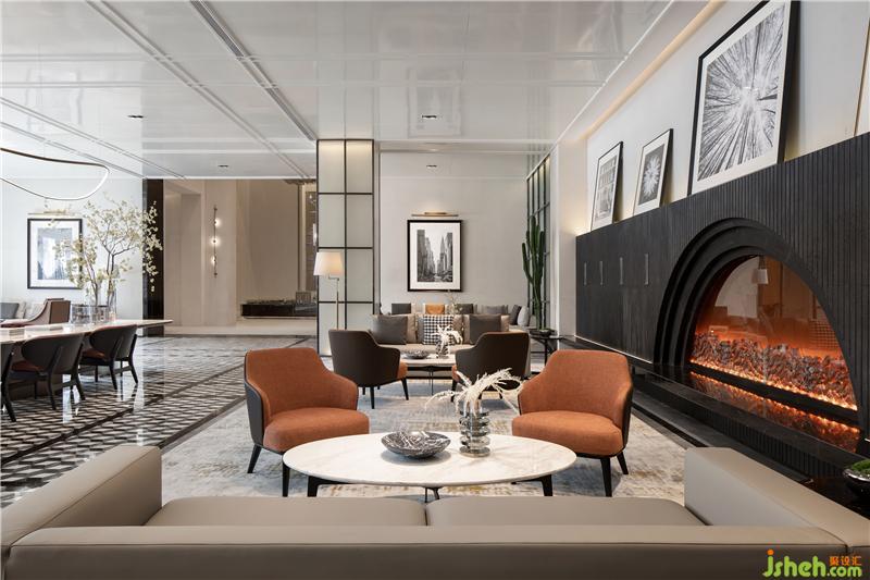深度洽谈区的一侧是由墨金大理石构筑的壁炉墙,黑白的自然或建筑剪影像装点其上,定格记忆力与想象力;浅米色的布艺软包与褚棕色单椅的搭配,深浅相宜。设计将人文气质融入空间,缔造领悟艺术的时间,令观者的内心在片刻中得到沉淀与触动。