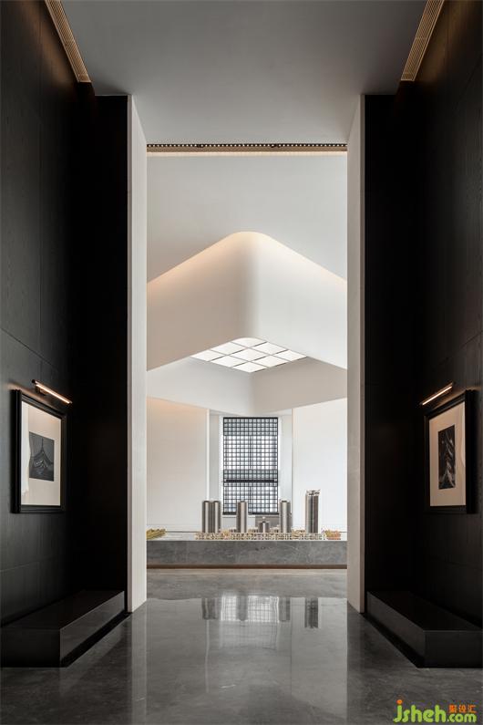 建筑是悠长蜿蜒的弧形动线,室内廊道如同一幅静静摊开待阅的长卷。营销中心设计师引用经典的中轴对称,一张一合,一进一景的铺陈手法,去创造高低错落的节奏和空间序列。