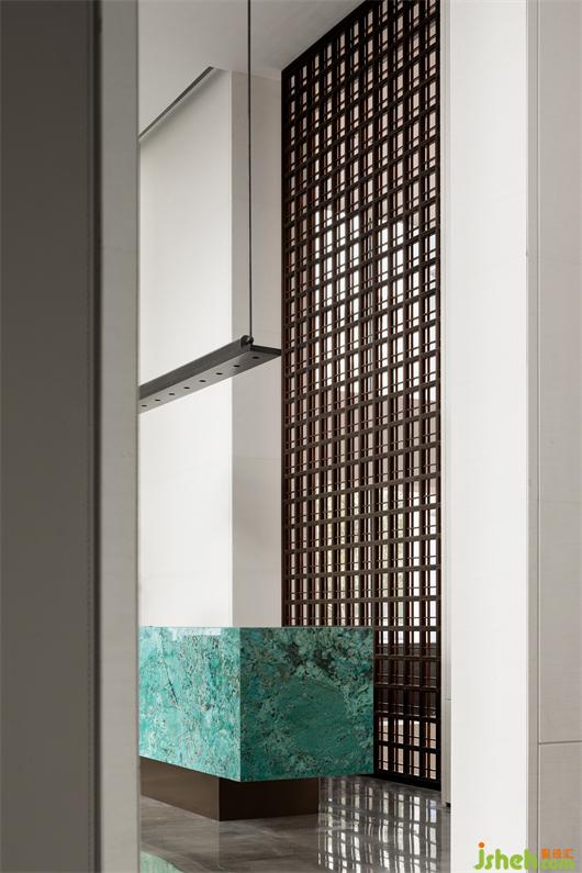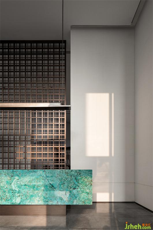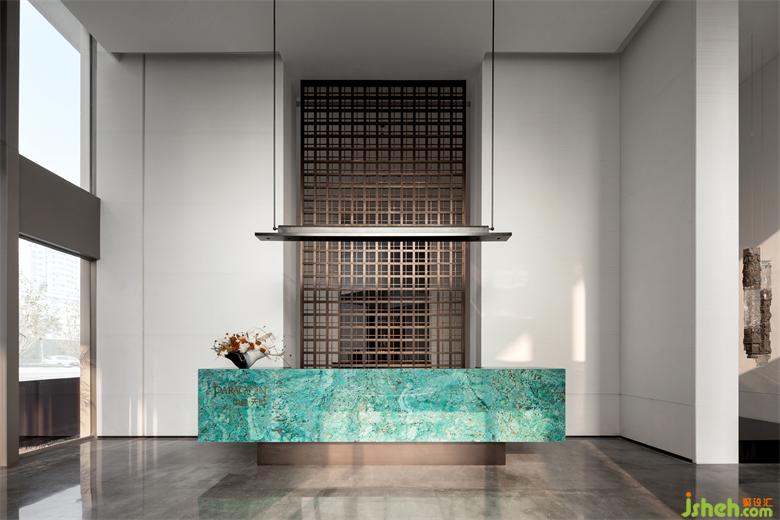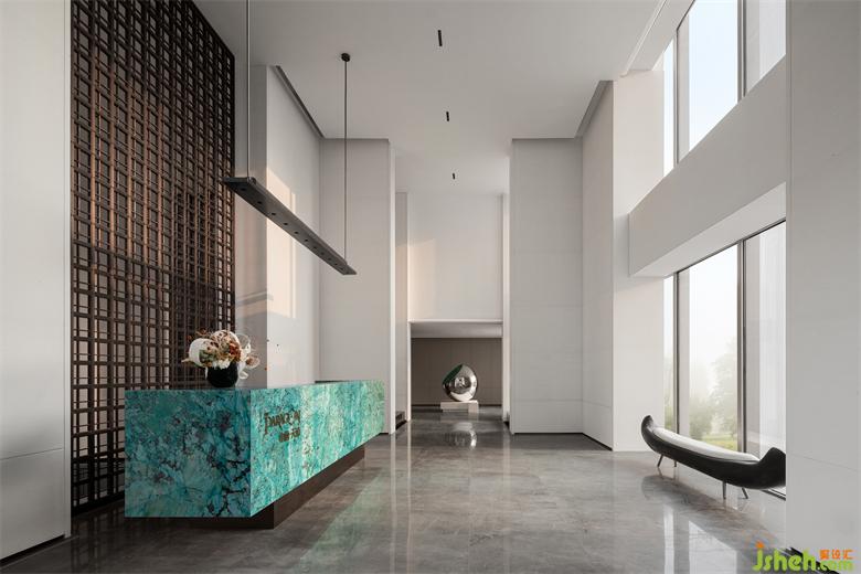 接待厅,我们特意寻觅了孔雀蓝色彩的奢石,精细打磨围合出一方细腻且高雅的接待台,形成视觉的第一会面空间。