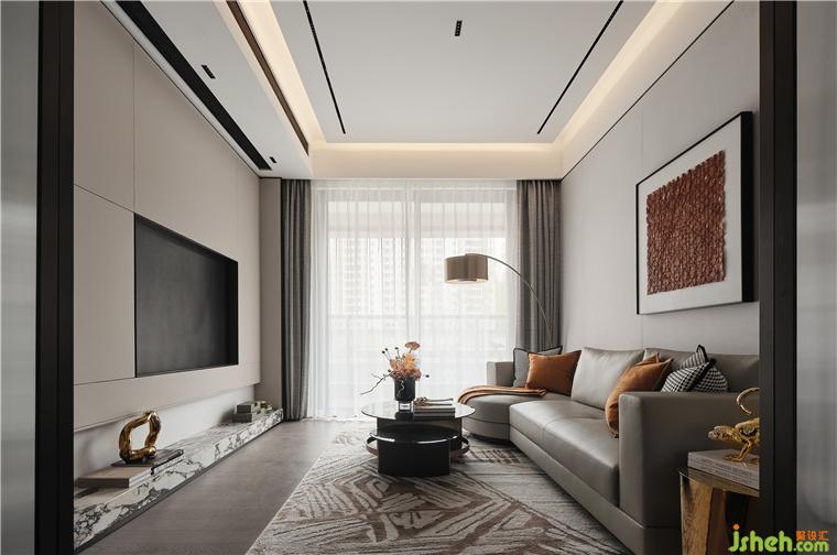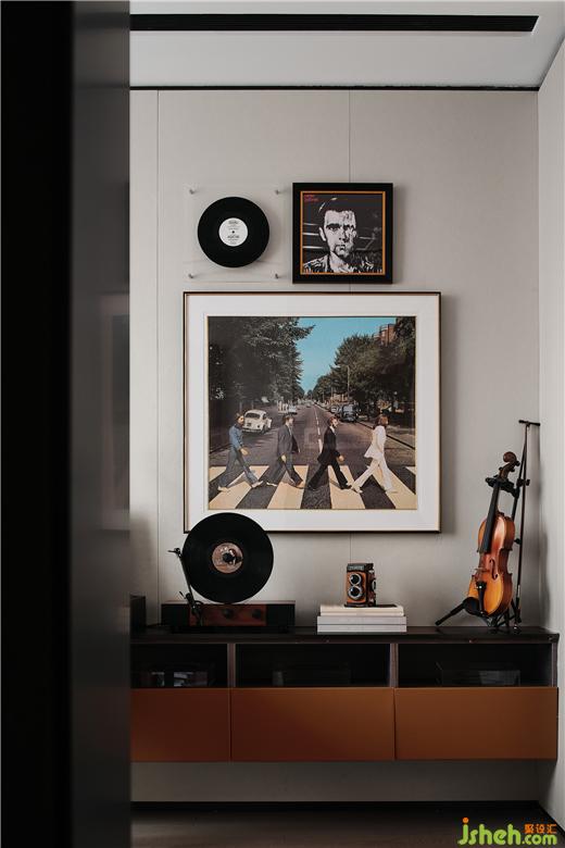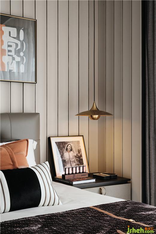 卧室背景墙以格栅造型围合,既是一种设计感的凸显,也是一种场景的渲染。别墅装饰简洁的灯饰带来了暖色的灯光,照亮了照片上人物的笑脸,这带来一种氤氲的画面,安逸、朦胧的情绪渗透于空间,使空间氛围感更强。