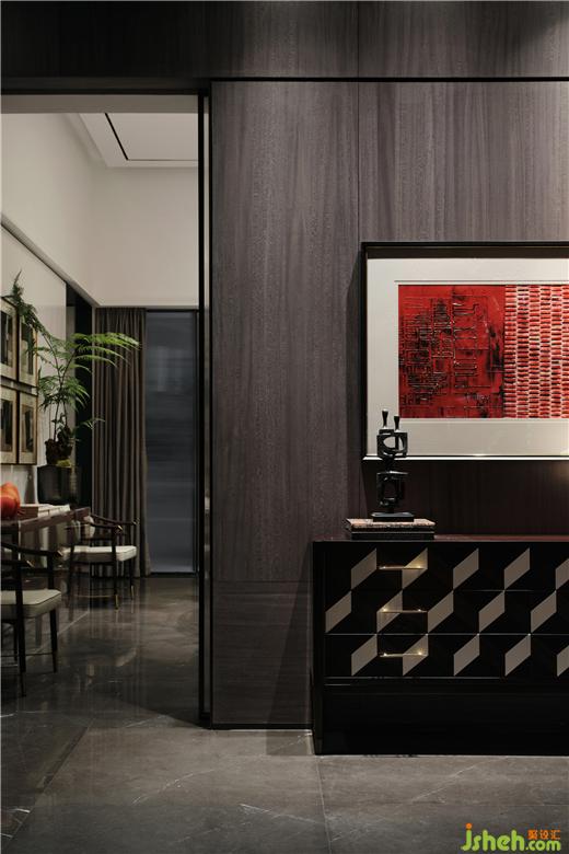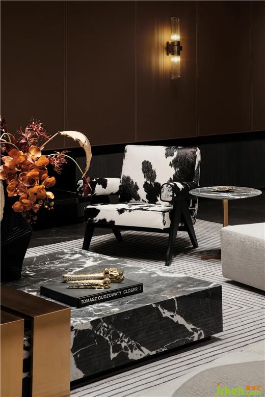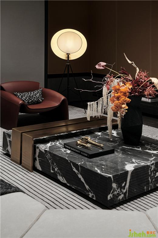 在咖色的基调上,软装陈设上穿插具有尊贵感鎏金色与朱殷红来丰富空间层次,这些色彩同时散发着独有的独特与纯粹,艺术品的植入、高级色彩的搭配与运用提升空间的品质,别墅装饰散发着独特与纯粹。