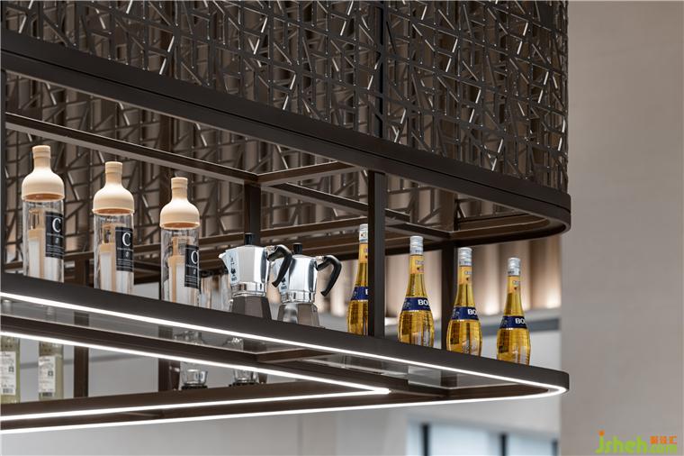 中间的水吧采用了有做旧质感的金属,镂空的雕刻造型富有工业美感。营销中心设计与天花的造型相融,能直观感受到日新月异的材料和工艺的变化。