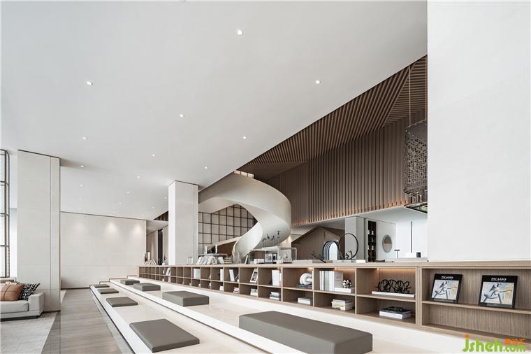 营销中心设计师利用层高的落差顺势设计成阶梯书吧,丰富了空间体验层次,书柜上摆放着书籍和文化艺术品,让场景展开更多交互,营造放松的场所氛围。