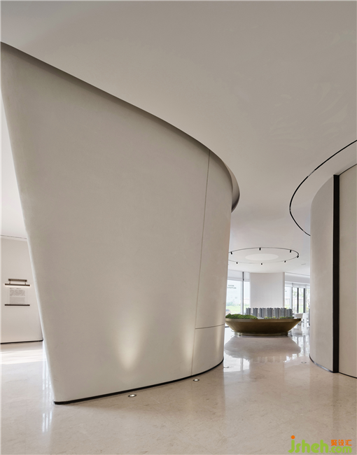 从宏观布局可发现,售楼中心设计师在空间平面布置上有意通过弧形的块墙界定各个空间的功能分区,弧形的空间围合增加了空间的趣味性,让空间流线有了一定的节奏感,使得空间通透且灵动。