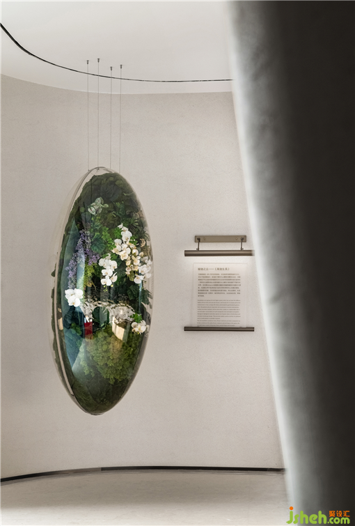 吧台台面则是植物的世界,摆满了各类植物标本,售楼中心设计以供我们认识身边的自然。洽谈区与水吧的方位是对座方式,以便创造更好的交流体验感。