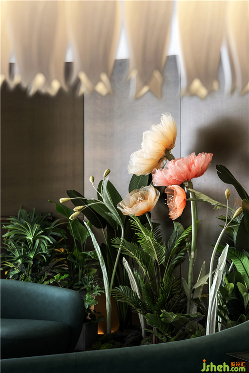 植物艺术装置,将自然界随处可见的苔藓与花材等复合材料结合,售楼中心设计将森林山谷中的万物共生的寓意缩影于此,增强空间的生命力与气场。