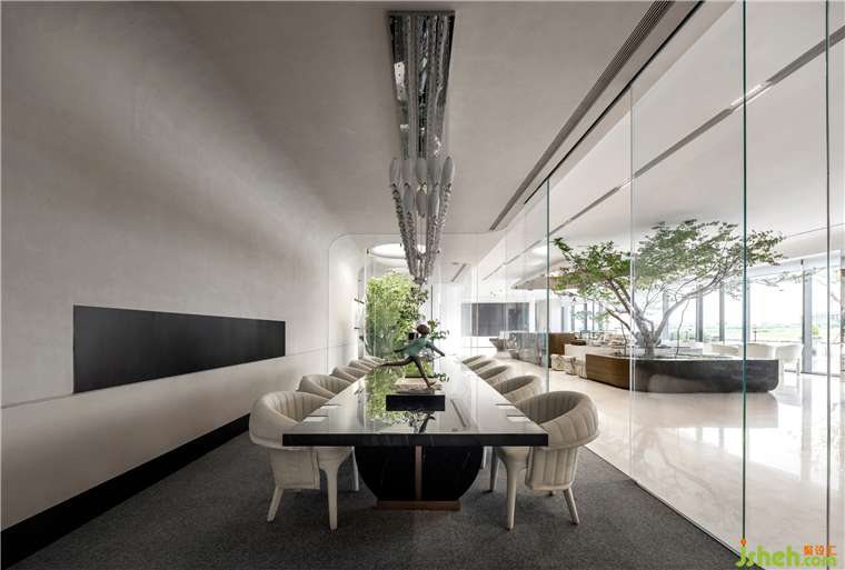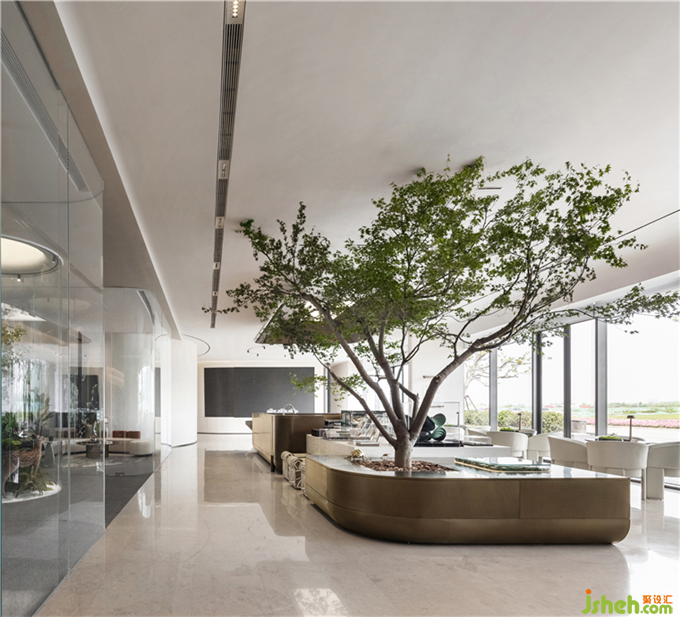一棵绿色的树长在室内成为耀眼的存在,它强化了空间以自然为核心的主题,售楼中心设计给环境带来了生机。