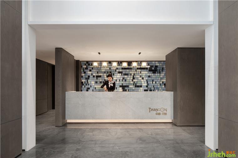当代艺术品更多地在追求造型的简化,转而注重向内的思考。由2800片陶瓷片构成的水吧台背景墙,营销中心设计吸取了琉璃的部分制作工艺,经历成型、素烧、施釉、釉烧终成绚丽效果。
