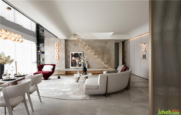跃层户型的难点之一是楼梯的设计。我们将楼梯放在了客厅背景墙的位置,尽可能地少占用面积,样板房设计不阻碍空间功能区的完整性,令到客餐厅有连贯的宽裕尺度。楼梯间接成为了室内视野的焦点处,因此其造型设计至关重要。