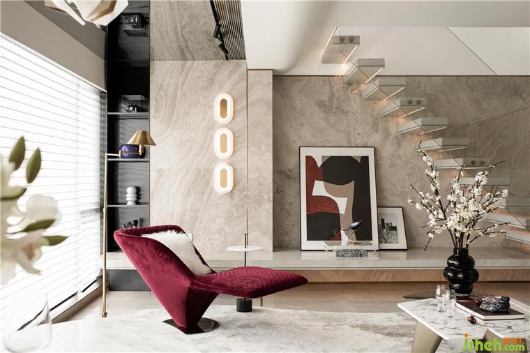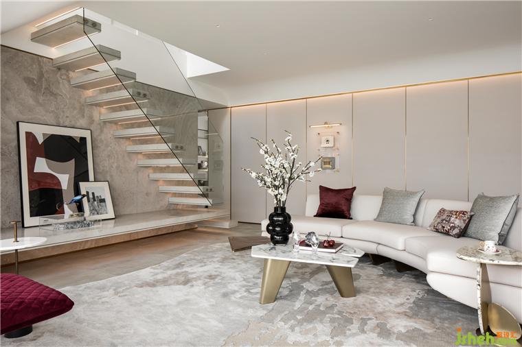 隐形的超白玻栏杆,石材作为踏步,直接展示了梯步的材料和形状,样板房设计具有轻奢感的楼梯成为空间的立体“雕塑”。