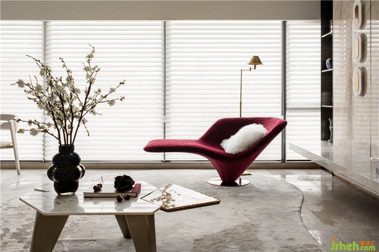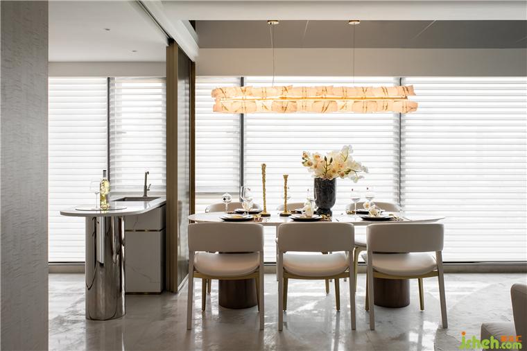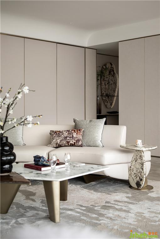 样板房设计简洁的空间中大面积运用了暖白色系的材料,石材、木饰面、皮革、金属等,通过细节材质的变化陈述空间,去表现一种不落俗套的审美意趣。