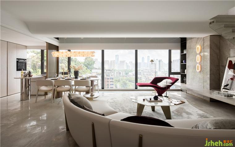大横厅全落地窗尽揽室外风景。沙发的造型及摆放方式是灵活且具有趣味感的,配合一张圆形地毯更增添了空间的圆润度、轻盈感。