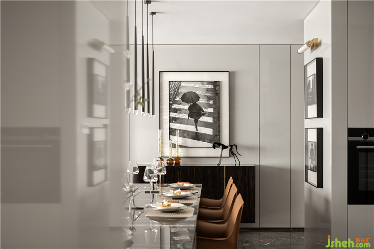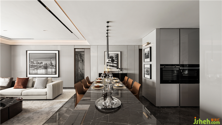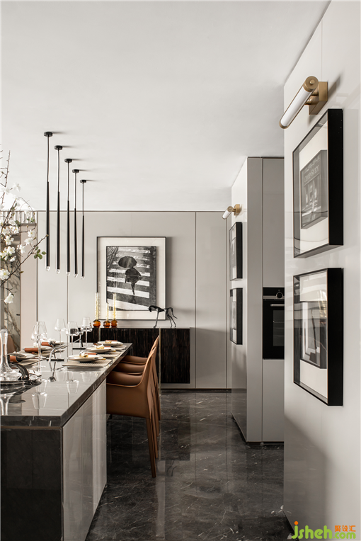 样板房设计3.6米的多功能餐吧是该户型不同于常规家庭设计的一大特点,长桌的利用率增强,它不仅是日常的餐桌,也可以当工作台,游戏、手工、烘焙等都可在这里进行,利于家庭成员间的交流活动。