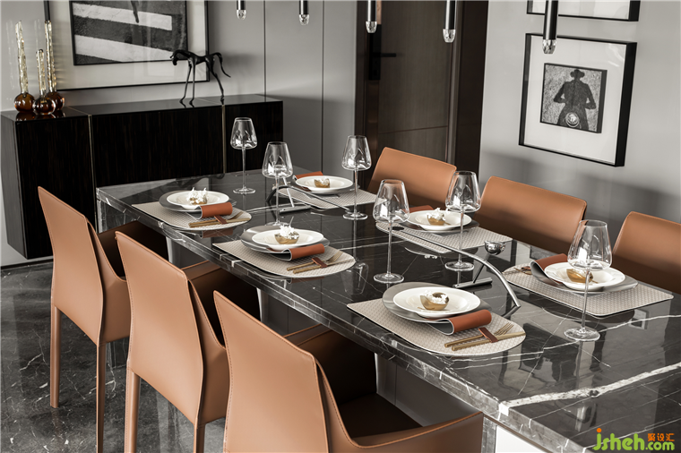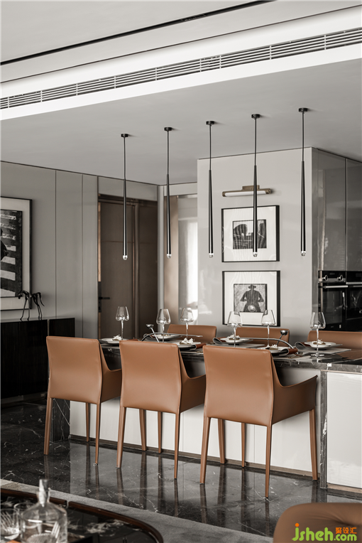 大理石餐桌搭配皮质餐椅体现空间的品质感,再搭配装饰吊灯,增加空间的品质感。