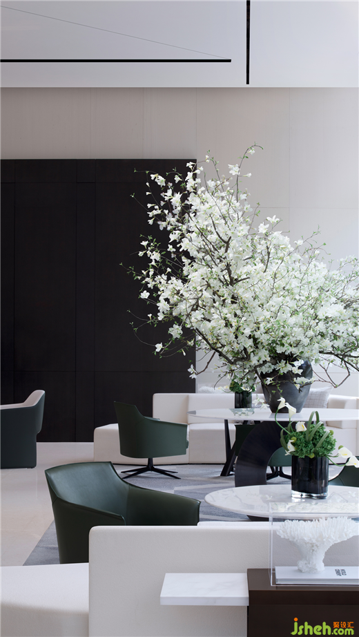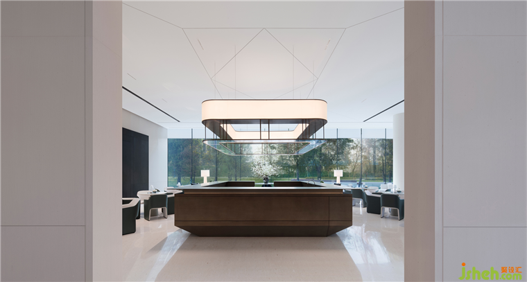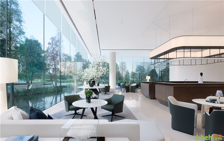 项目原场地未来属于城市生态公园,树木、湖水、阳光,生机盎然的园林室内依托室外景观带,顺德悦府示范区设计以“亲水亲景”的布局,将内在与环境合为一体,模糊了空间的边界。