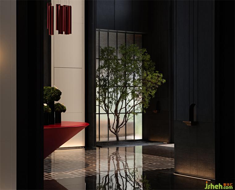 具有雕塑感的端景台,其经典的几何轮廓感,亮眼的红色漆面,赋予空间时尚典雅,在硬装深色基底,现代简洁的衬托下,形成强烈的视觉张力。