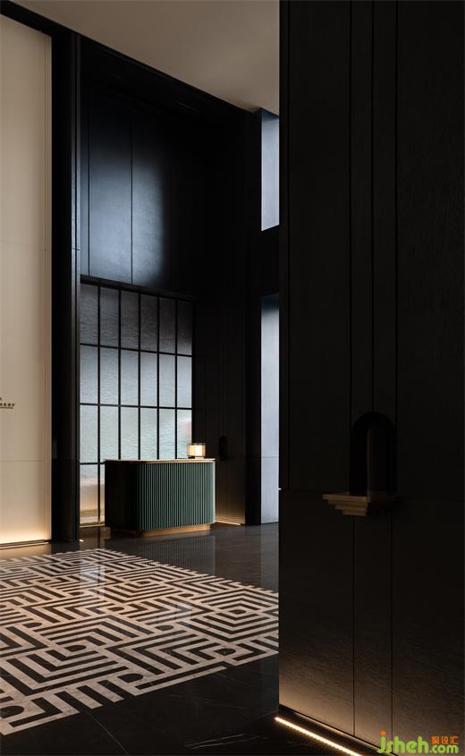 石库门的几何造型提炼至界面的装饰语言,体现于门扇把手的造型,屏风木饰面的定制细节,以及地面的石材拼花。
