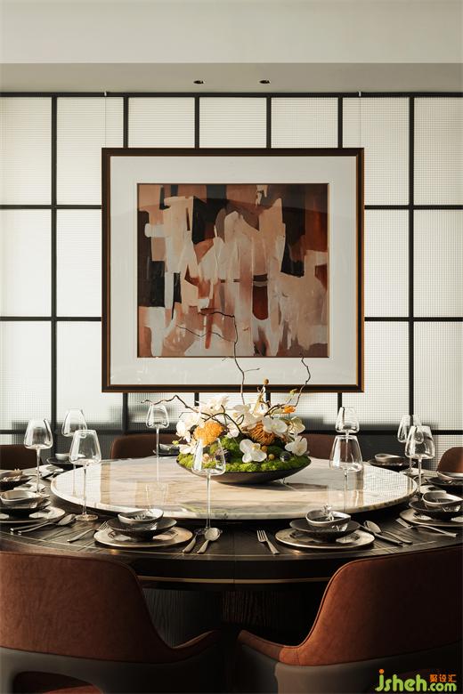 玻璃屏风虚实结合,为会客厅增添一定的私密感和秩序感,构成对称均衡的空间比例。