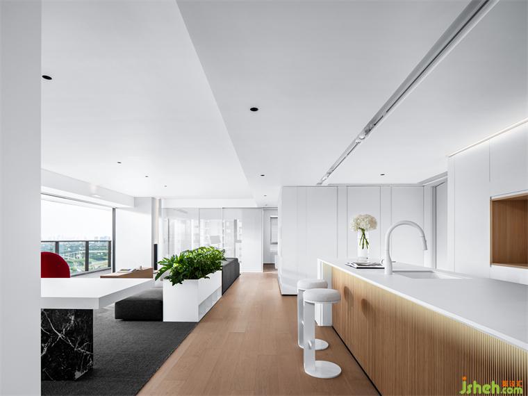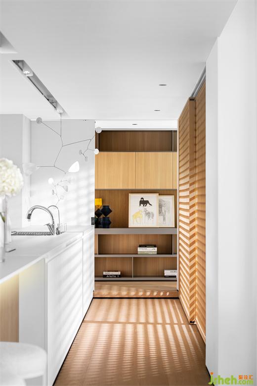 餐吧表面的饰面材质有着温润朴实的质感,在顶部灯光的映射下,材质、色彩与光影交织融汇成一曲优雅的韵律。餐吧的底座由天然大理石构筑而成,天然雕饰的纹理通达自然,流露出晶莹清冽的质感。江景大平层设计阳光从百叶窗的缝隙溜走,艺术装置《竹蜻蜓》在微风中摇曳,一动一静,荡漾着盎然的生命力。