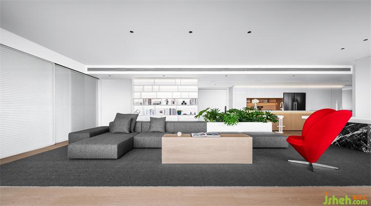 纯白,予人干净、温馨之感,纯白也给了现代家居设计更多想象的空间。在沙发后部的墙体上布置了一面纯白色书柜,简约的线条搭配别出心裁的灯光设计,体现出简洁而丰富的艺术趣味。底部加设了置物柜体,江景大平层设计小朋友可以踩上柜体拿到高处的书,细节满满的设计,极大地增加了美好空间人居体验。实木的柜体上亦摆放着童趣摆件及香薰蜡烛,为整个清新淡雅的空间增添了独特而有趣的微妙变化。