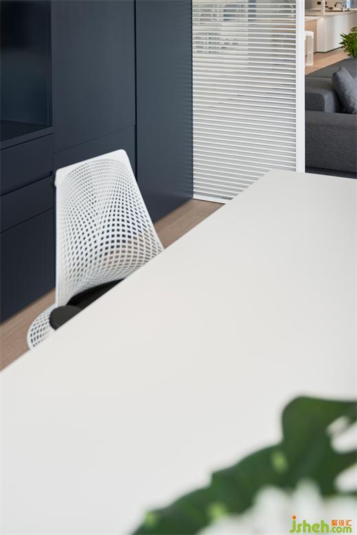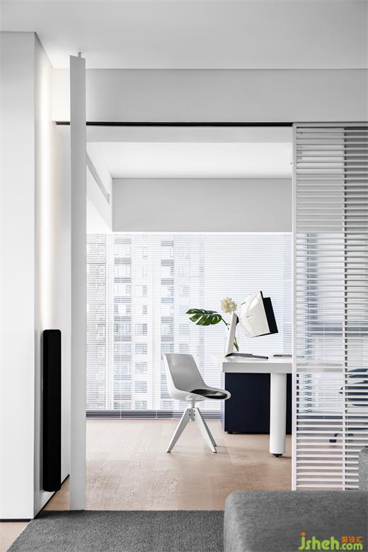 多功能区以两扇镂空格栅木质趟门隔开,晨昏日暮,光影穿过木门,在地板和柜子上渲染出光晕,有“疏影横斜,暗香浮动”的静谧,也有“和光同尘,与时舒卷”的安然。