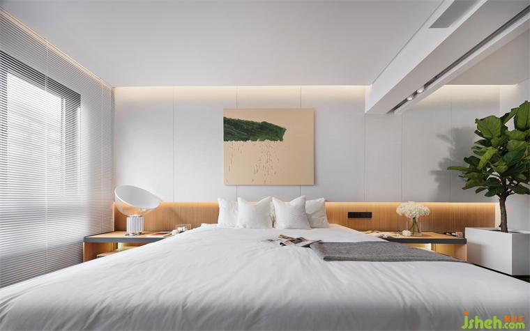 主卧的房门以隐形门的形式从墙体延伸至走廊,将主卫和卧室分隔开。主卫与过道之间同样布置了一道双面镜面趟门,镜面将户外的湖光山色引入走廊,再到主卧,即使是在闲暇休憩之余,也能将室外美景尽收眼底,江景大平层设计一览无余。镜面趟门前亦布置了李友友设计师亲笔誊绘的画作《大海》,宁静深邃的海面,清澈透亮的天空,海天一色的画面中夹杂着几丝来自家乡釜山的海风。日光熹微,海风微咸,勾起人心中淡淡的乡愁。