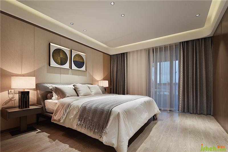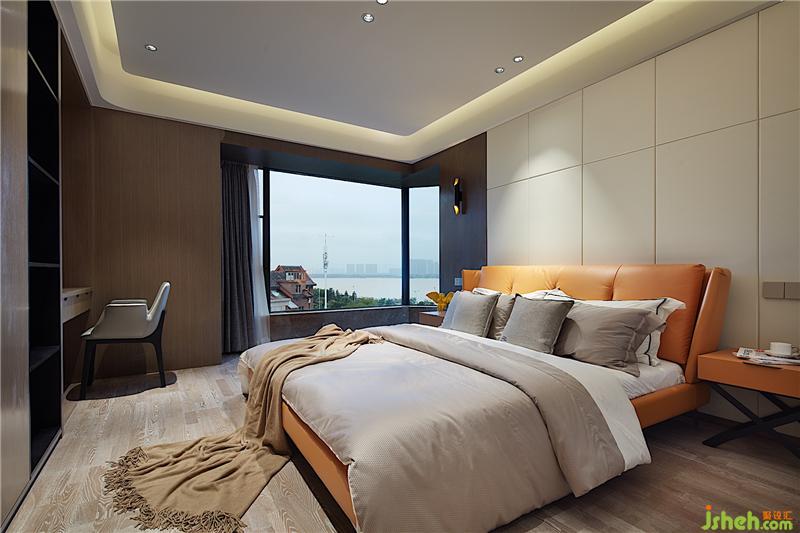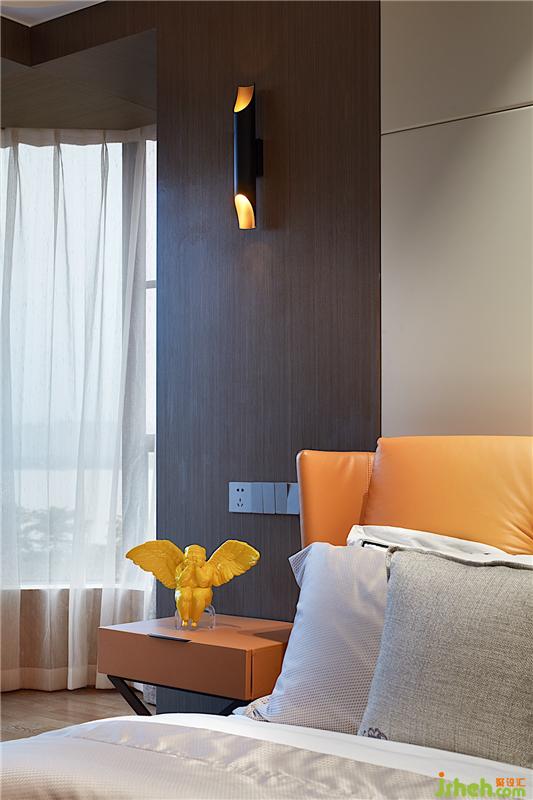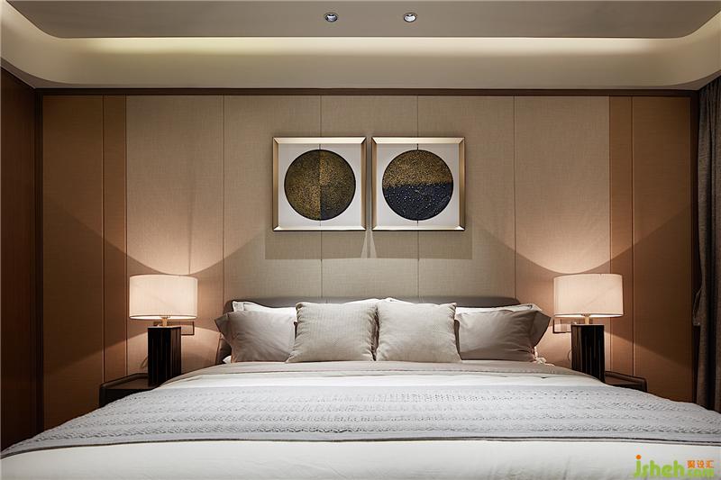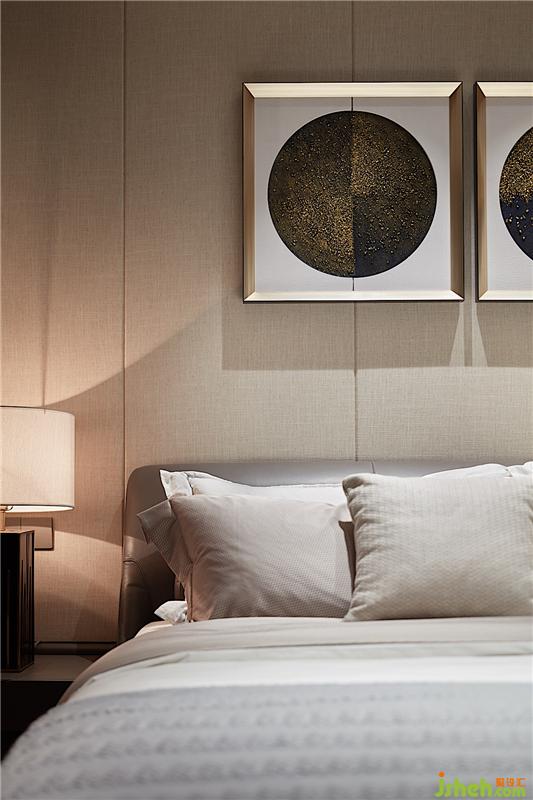 主卧看似和客厅相似,使用的材料却全然不同。客厅大部分以石材为主,而主卧则是采用麻布硬包,手感柔软细腻。设计师通过使用材料不同,强烈对比出两个功能区的柔和与刚硬,体现出主卧的那份宁静与闲适安逸。