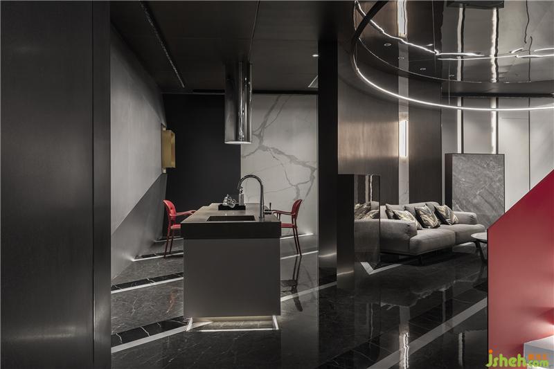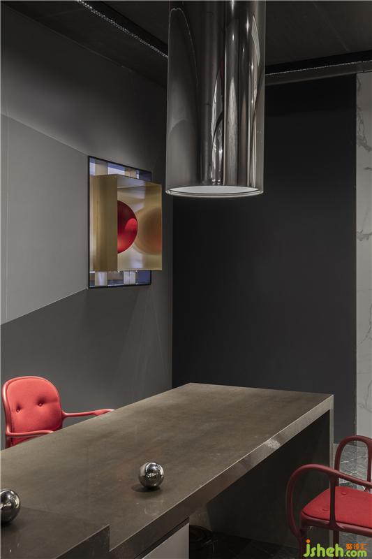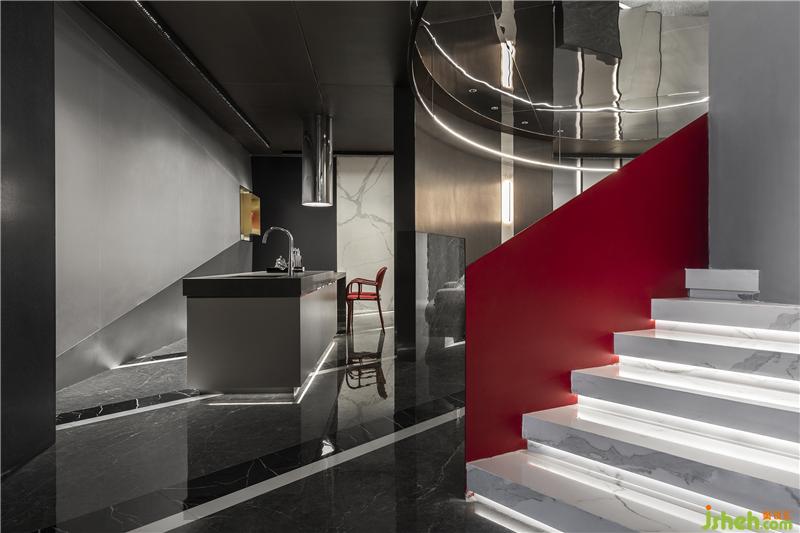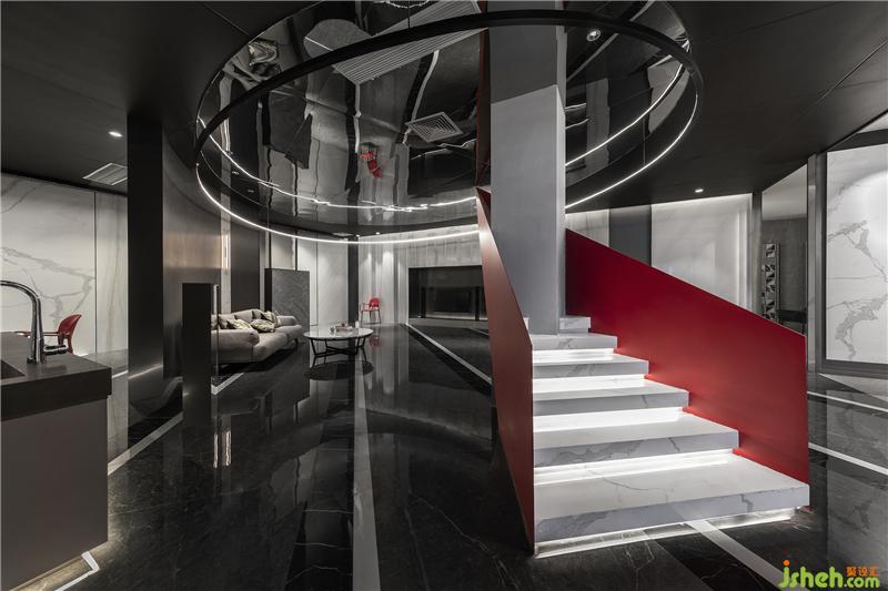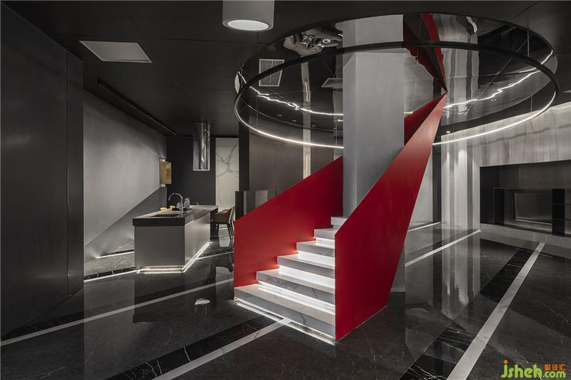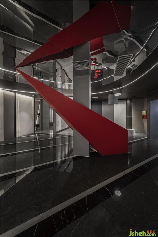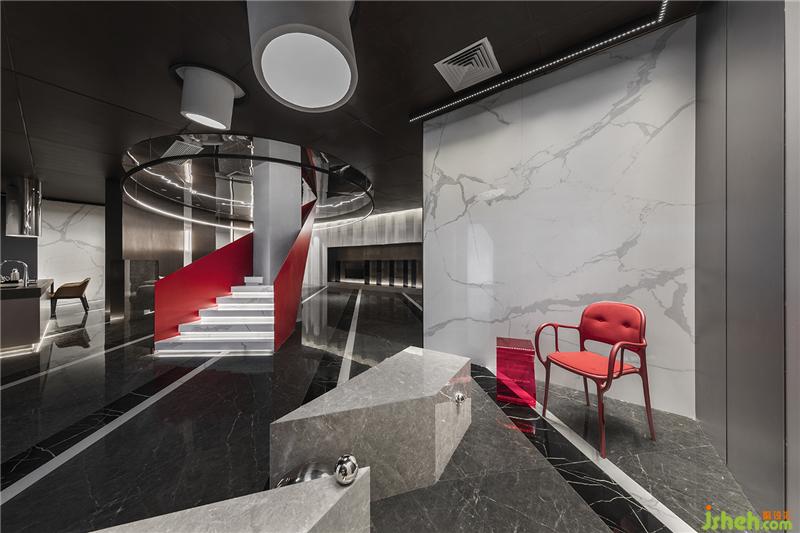 展厅中心的楼梯以汇聚的块面和鲜红的颜色宣泄出空间独特且富于张力的情绪,有着当代艺术的特色并积极调动参观者的感官。在“拉伸”的空间中,开阔性和层次感都得以强调。装修公司