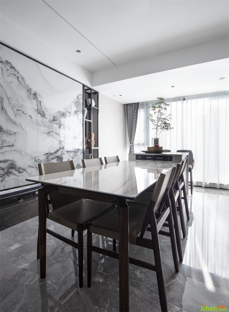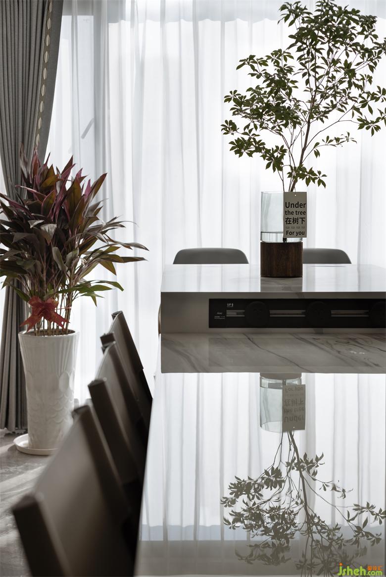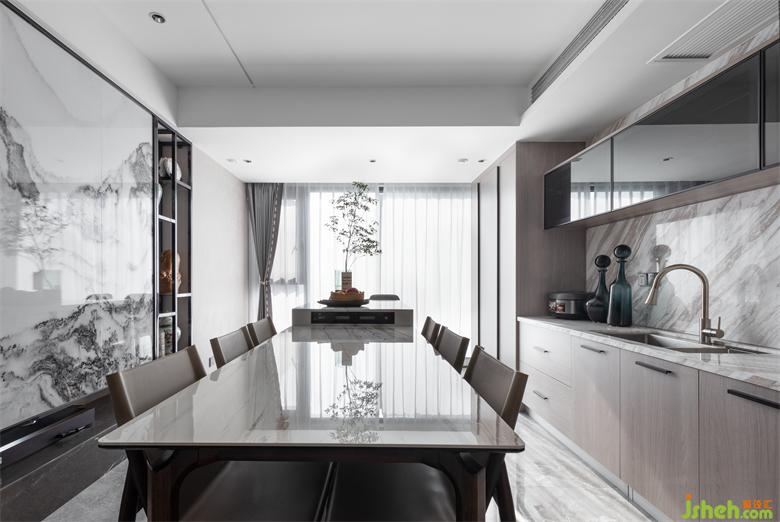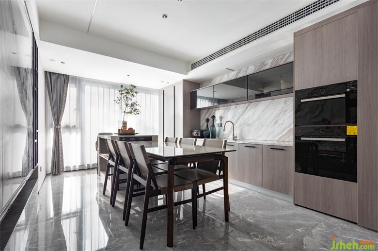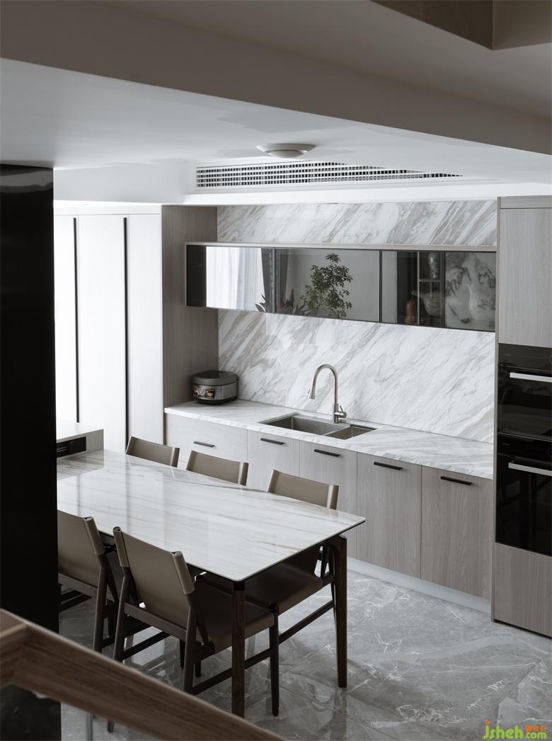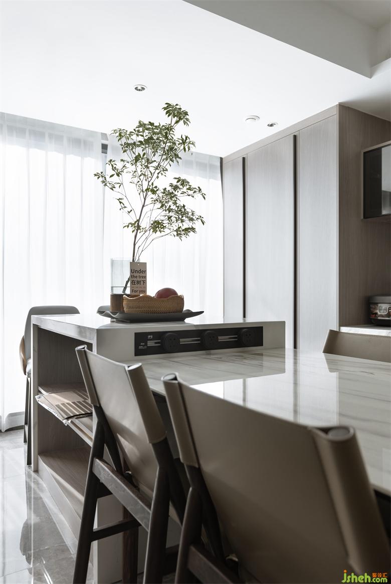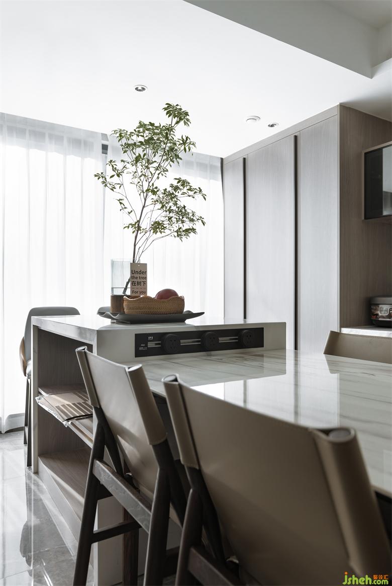 采用半隔断的形式,使得客厅与餐厅同为一体,室内设计师获得空间调性活跃的优势,设置在这里的蒸箱烤箱也能很好满足烘焙烹饪的需求。