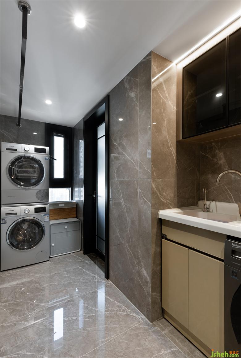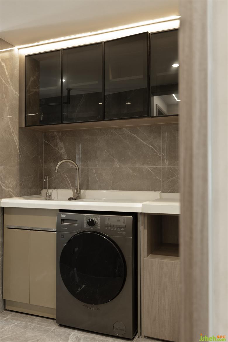 二楼家政间洗衣池,在公卫外另外设置的洗衣机烘干机,总计三台清洗设备,很好满足住户的清洁需求且通过对过道的利用,一楼的生活阳台能够腾出空间,实现餐厨一体的应用。室内设计师