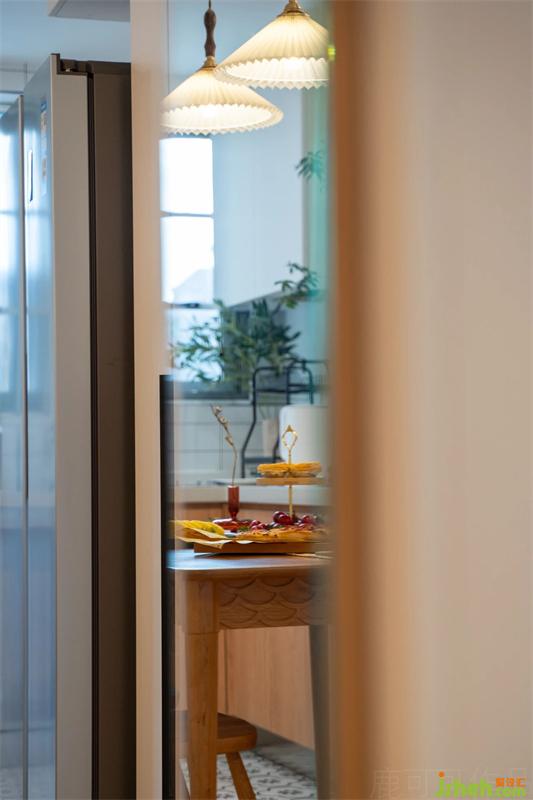 餐桌旁边是结合橱柜一起定制的餐边柜,放置一些用餐时使用频率高的物品,这款餐桌是带抽屉的,抽屉底下设计了一个长条形的槽,可以直接放置纸巾,很方便,不用占用餐桌的桌面。