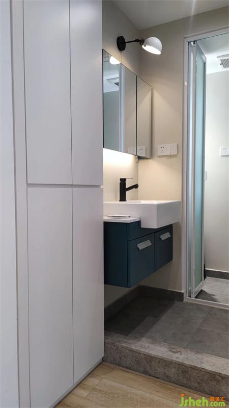 收纳柜的功能很强,只要位置合理,就会有他的身影,过道中的收纳柜,做的是无把手设计,好看之余是位置在过道,走来走去可避免撞到。旁边是外置洗手盆。