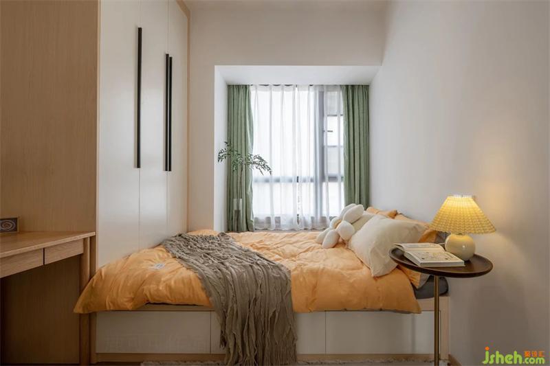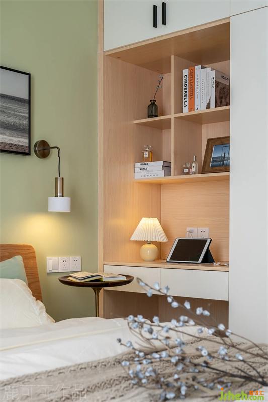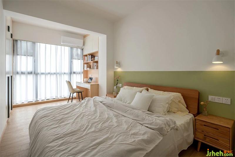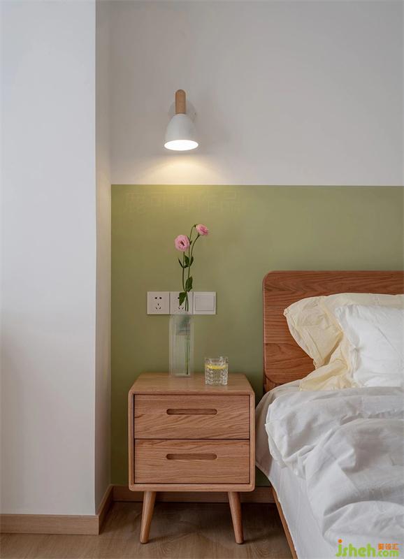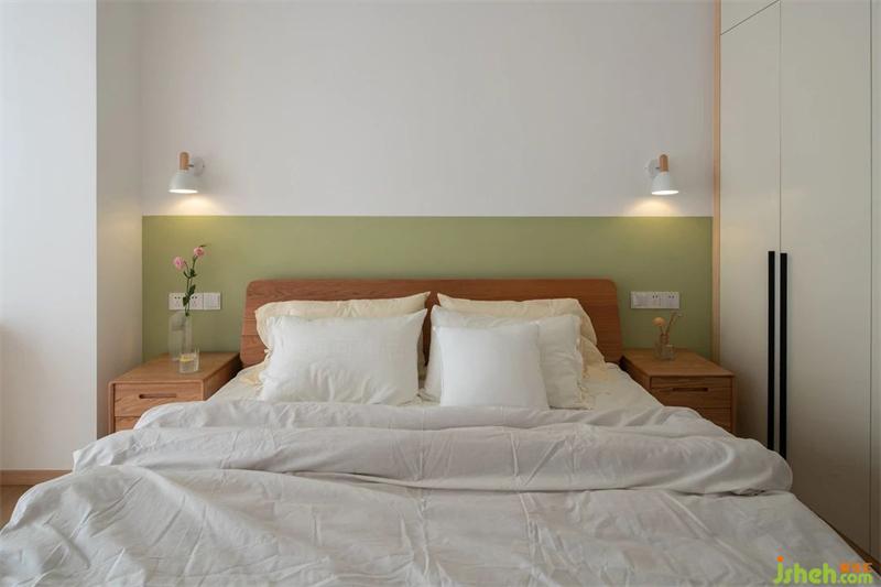主卧延续了客厅的清爽调性,床头背景是莫兰迪色系中的荷塘月色,搭配了原木色的床,既清爽又温馨。