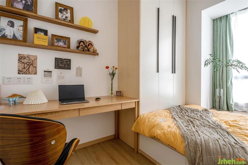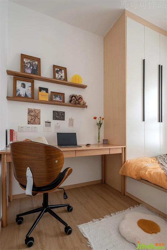 卧室与客厅一样,用了防水防燃的石塑地板,原木暖色调纹理,飘窗上通铺,整体性更好。利用飘窗凹位做了实用的收纳柜,可放置长阅书本,嘿嘿,我猜酷爱蝙蝠侠屋主也许会摆满他攒的Batman。