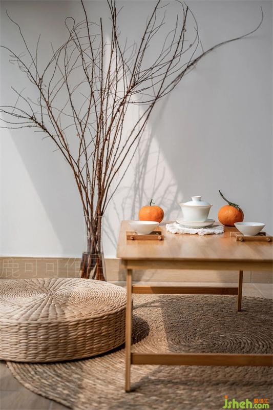 采光超好的阳台,地上摆放了变成枯枝的雪柳,墙面大面积留白,铺上地毯,架上茶桌,席地而坐边喝茶边享受着治愈的日出日落。