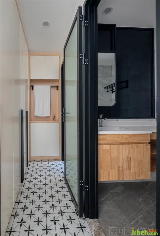 主卧设计了双面衣柜,衣服的收纳空间比原来多了一倍,靠近淋浴间的衣柜放置家居服,动线流畅。由于做了二分离的干湿分区,淋浴间与马桶间的隔墙上半部分设计了超薄黑玻来压缩墙的厚度,兼顾了隐私,黑玻搭配黑框吊镜提升空间高级感。