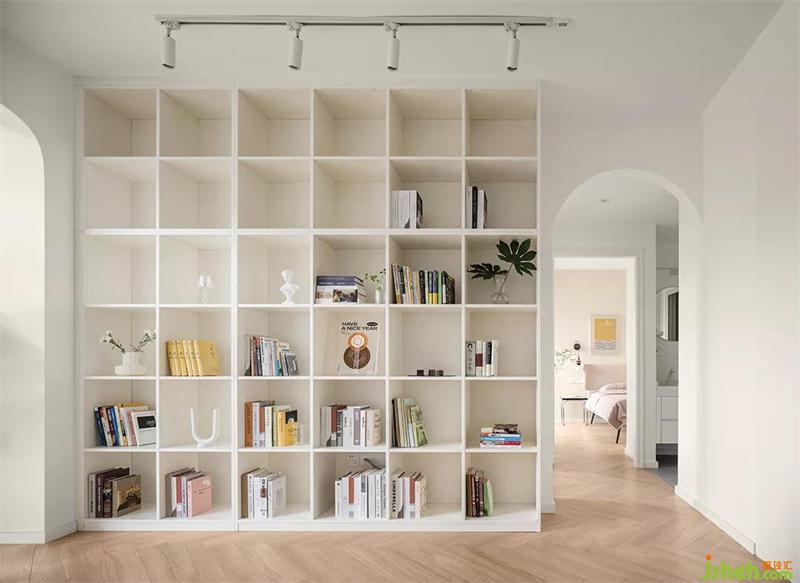 定制的奶油白到顶书柜做了统一的方形结构,统一的底色摆上各式书籍与个性收藏品的包容性很强,摆放品大小不一,却错落有致。
