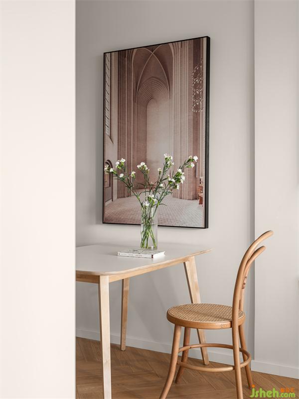 餐厅与厨房这边的窗户采光较弱,大面积留白的墙面通过光线反射使空间不开灯也比较明亮通透。