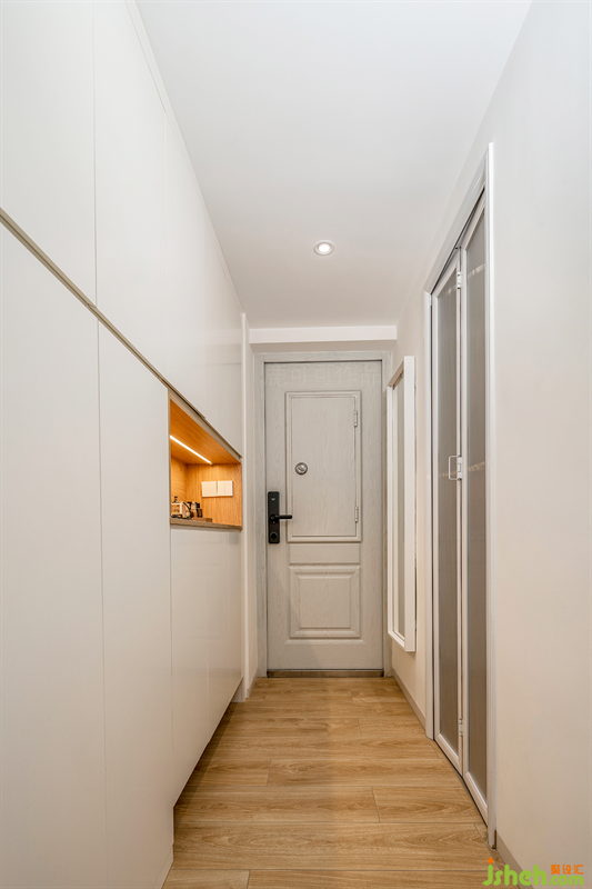 进门左手边全身镜,右边到顶鞋柜,鞋柜离地15cm放居家拖鞋,1米位置做凹位,放置回家的随手物品。入住后,叶子在中空位放了无线充电板,手机手表,耳机,回来电源就安排上,完美