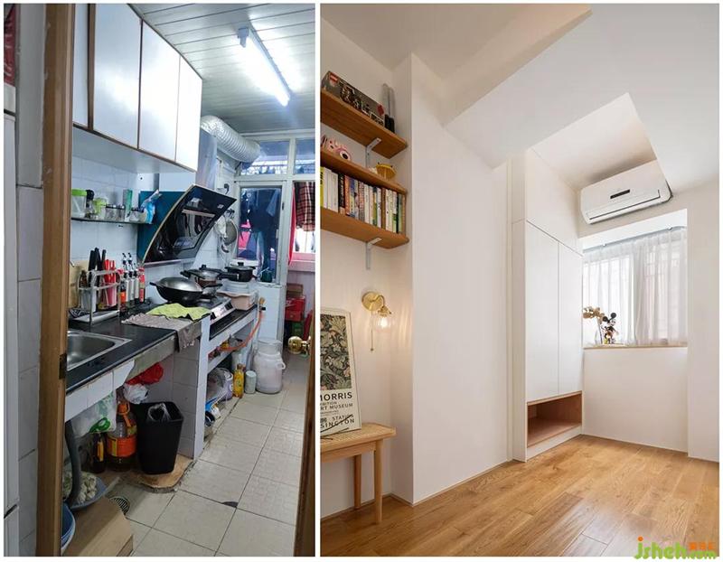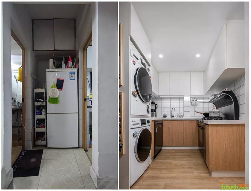 左边图片是改造前,是个小过道,重新布局时就觉得这个空间很浪费,压缩了原户型厨房113cm的长度把这个区域改造成了现在的开放式厨房,长度为214cm,深203cm,嵌入了洗碗机,集成灶,洗衣机烘干机等电器。