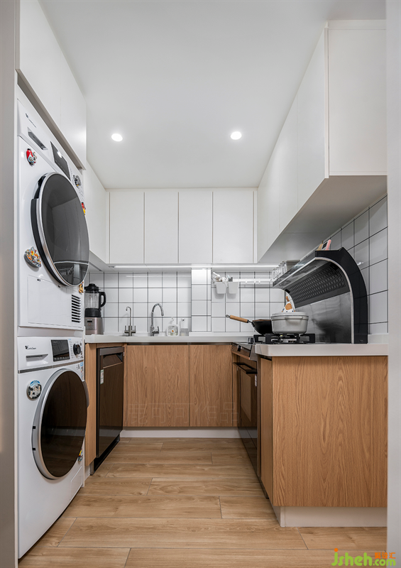 厨房墙面用了经典的白格子砖,U字形开放式厨房 ,洗烘一体机及洗碗机嵌入橱柜,遵循厨房黄金使用动线冰箱拿——洗——切——炒的动线。