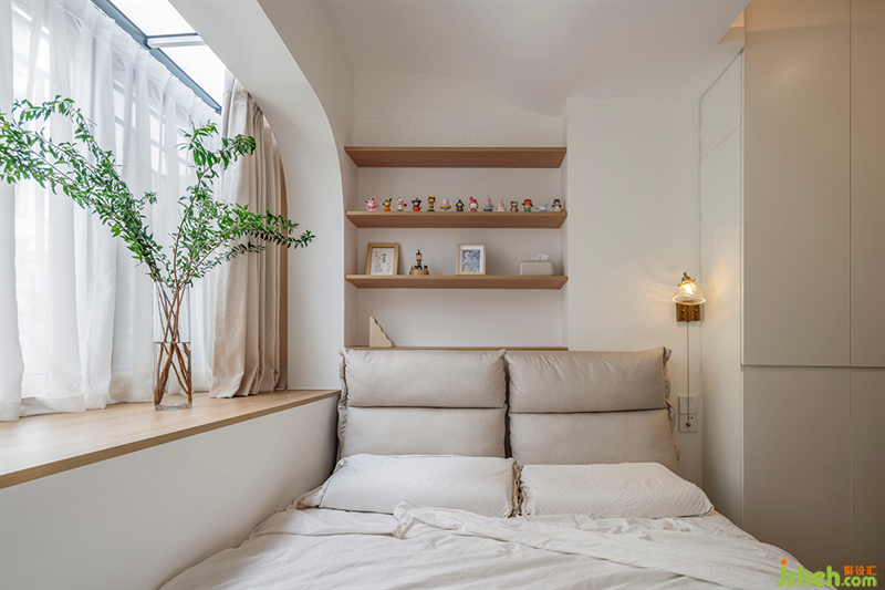 主卧整体奶呼呼的日式原木风,床的正上方有一条大梁,设计上做了弧形小波浪造型处理,很好的修饰了大梁,层高也不受影响。