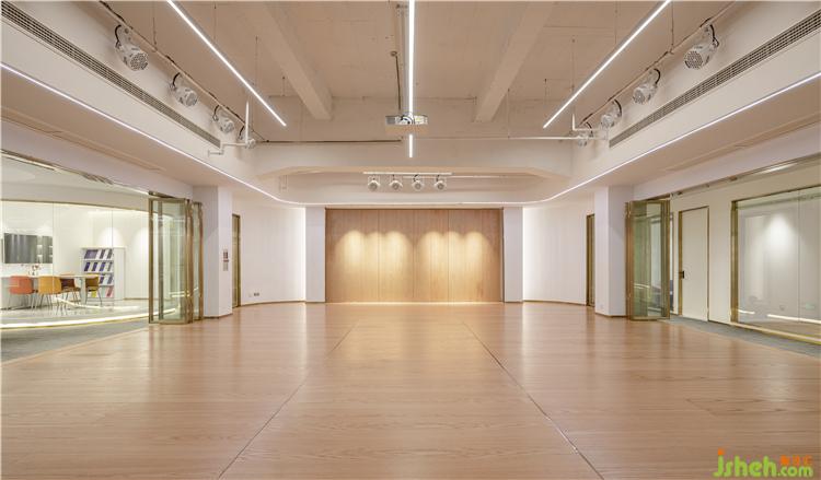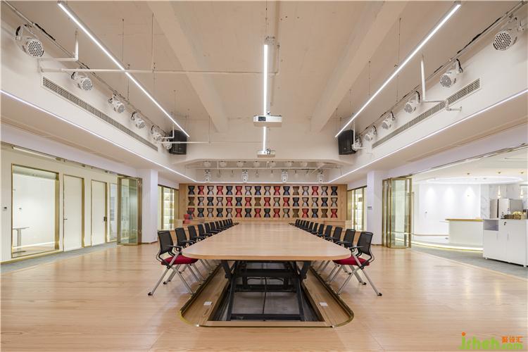 中间的秀场T台作为空间的中心主题,我们考虑了一个有趣的秀场环境及会议环境,此案中我们第一次将液压升降平台首次用在了办公空间,平台操控分为3个档位,第一个与地面抬高处齐平,在没有走秀及会议的情况下可以形成一个举办活动及patty的空间,第二档可以升高到45公分高度与靠后平台齐平可以形成一个T台的走秀,第三档升高到75公分处,也就形成了会议桌的功能,整个空间就可以形成一个大的会议室。办公区域围绕着中间的会议秀场区域展开设计,北面空间留给了高管层及财务室,南面空间给到开放办公区及茶水休息区。因公司档案文件及堆放较多,在空间的四个没有采光的角落给他们考虑了档案室及储物间的功能。办公室设计