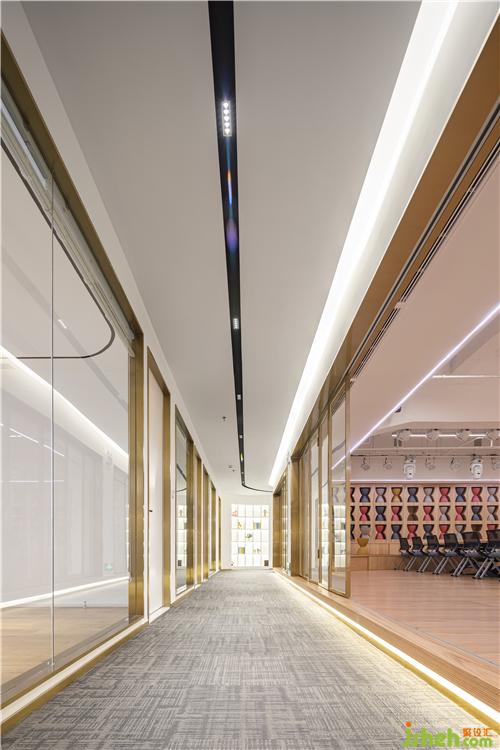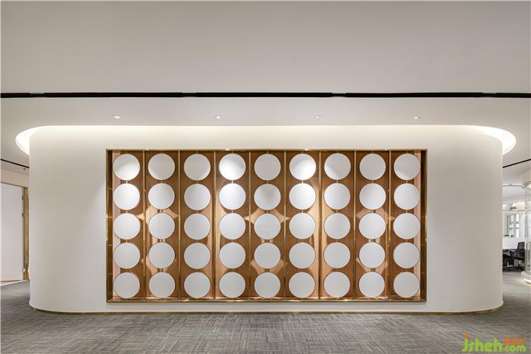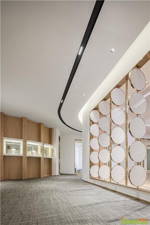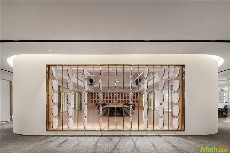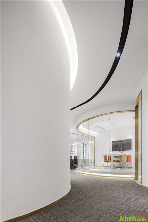 作为轻奢品代理的专享办公空间,解决了他们在发布新品走秀及大型会议功能,我们在进门处设计了箱包首饰展柜给客人或者员工进门就可以看到的产品。弧线设计增加了整个空间的动感与时尚。办公室设计