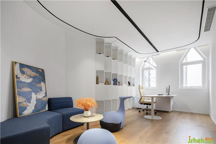考虑办公人员职场女性居多,此次设计上我们将女性的柔美及干练都在弧形的墙面结构及黑白色调体现出干练与整洁,中间的空间既可以是秀场可以是活动教室甚至可以是一个大的会议室。办公室设计