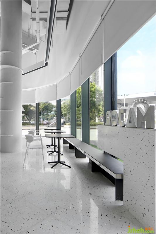 吧台和制作轻食的半开放厨房被安排在室内唯一的墙面区域,室内桌椅的摆放根据异形的室内空间及其动线,散而有序的分布。餐厅设计